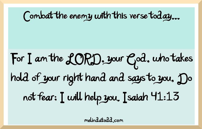 We are combating the enemy! With one verse everyday! Join us. Each verse will also be shared on the Facebook Fan Page. Be encouraged sister! Jesus cares for YOU. Feel free to share these verses!