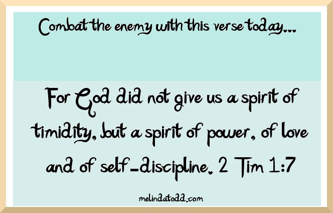 We are combating the enemy! With one verse everyday! Join us. Each verse will also be shared on the Facebook Fan Page. Be encouraged sister! Jesus cares for YOU. Feel free to share these verses!